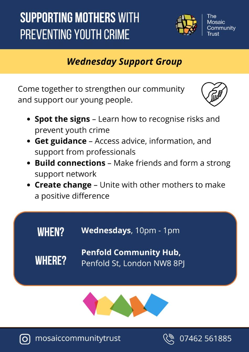 Please see a weekly programme of groups and services offered by Mosaic Community Trust. You can also find further details about their Wednesday Support Group centred around Supporting Mothers with Preventing Youth Crime which takes place weekly at Penfold Community Hub.